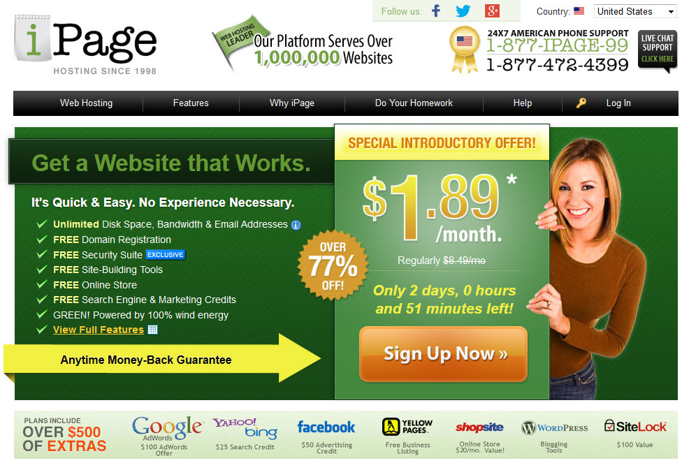 That was just a snapshot of iPages full offering, which also includes free domain registration (most other hosts charge around $14.99 for this) and approximately $450 in marketing credits (not uncommon with similar hosts). They also offer a key feature (and one that we love here…or at least I do), the famous Anytime Money-Back Guarantee:
